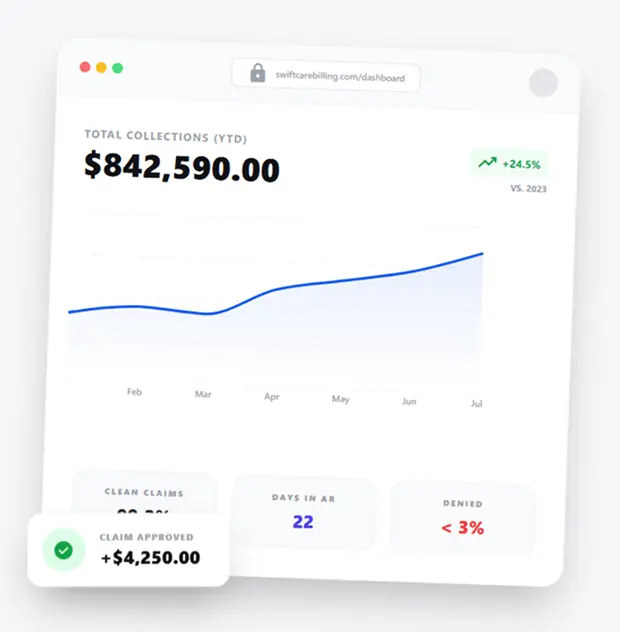 Most practices come to us after dealing with the same frustrations for too long. Claims submitted late! Denials piling up with no clear explanation! A/R sitting untouched for the past 90 days! Staff stretched thin between patient care and billing follow-up! Reports that take too long and say too little! It is not a people problem. It is a systems problem that a dedicated medical billing company like SwiftCare Billing solves for you.