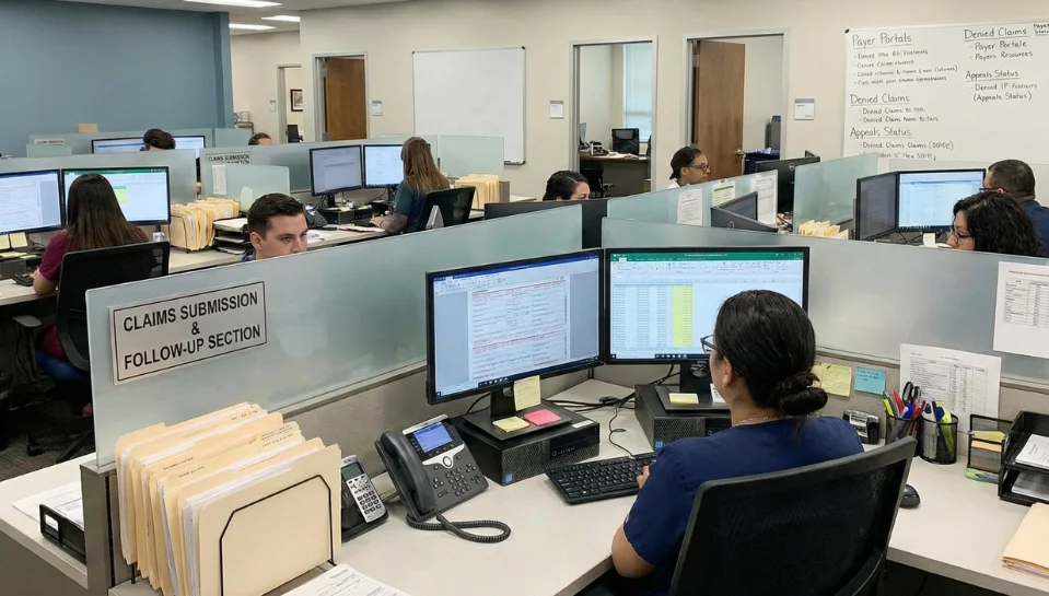 Outsourced medical billing refers to partnering with a professional Revenue Cycle Management (RCM) company — like SwiftCare Billing — to handle your entire billing process. This includes charge capture, coding, claim submission, denial management, payment posting, and patient collections.